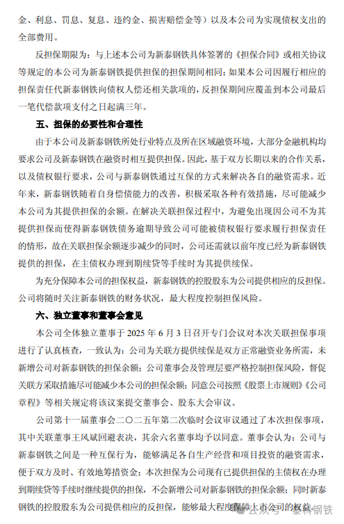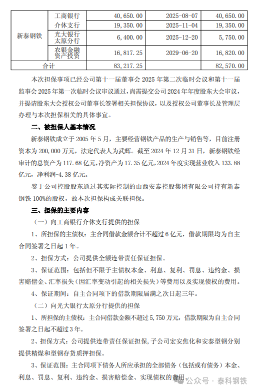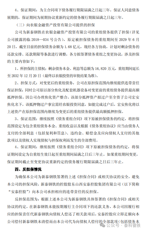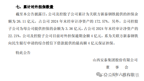 本次擔(dān)保由新泰鋼鐵的控股股東山西安泰控股集團(tuán)有限公司提供了反擔(dān)保,并需提交公司2024年年度股東大會(huì)審議。目前,公司及控股子公司累計(jì)為新泰鋼鐵提供的擔(dān)保余額占公司2024年末經(jīng)審計(jì)凈資產(chǎn)的 172.57%。此外,公司及控股子公司對(duì)外擔(dān)保逾期金額達(dá)4億元。