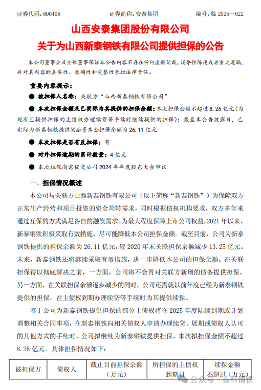 6月6日,安泰集團(tuán)發(fā)布公告稱,將為關(guān)聯(lián)方山西新泰鋼鐵有限公司提供不超過(guò)8.26億元的擔(dān)保,主要用于現(xiàn)有已提供擔(dān)保的主債權(quán)辦理續(xù)貸等手續(xù)時(shí)繼續(xù)提供的擔(dān)保。截至公告披露日,公司已實(shí)際為新泰鋼鐵提供的融資本金擔(dān)保余額為26.11億元。