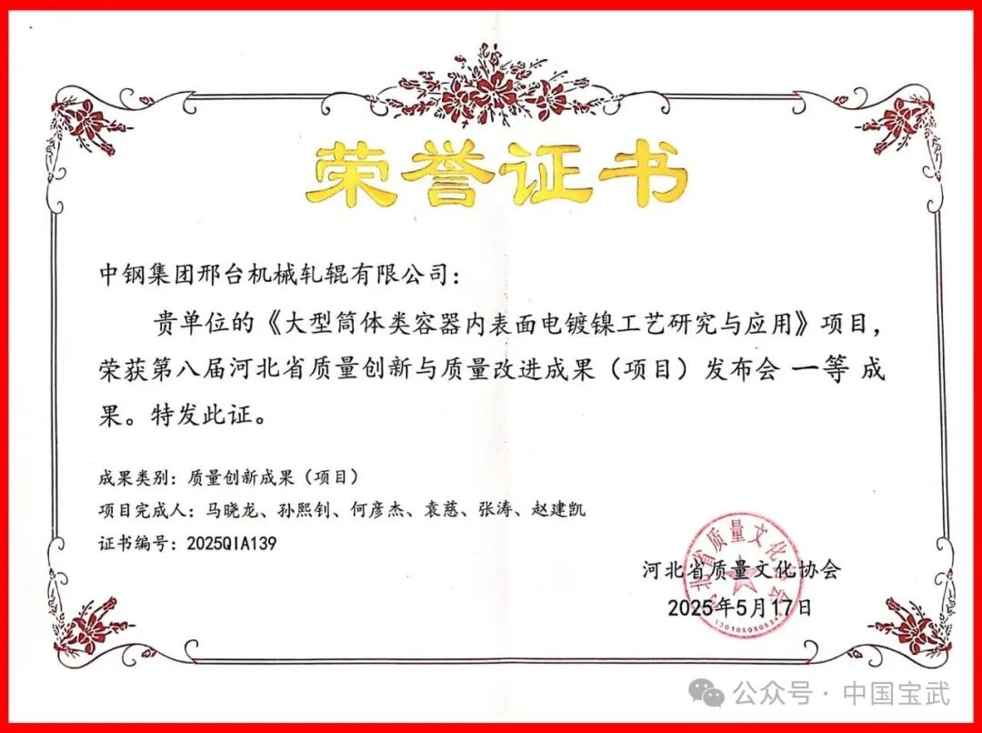 近日,在第八屆河北省質(zhì)量創(chuàng)新與質(zhì)量改進(jìn)成果發(fā)布會暨經(jīng)驗(yàn)交流會上,寶武智維、寶武重工中鋼邢機(jī)《大型筒體類容器內(nèi)表面電鍍鎳工藝研究與應(yīng)用》《打造熱處理數(shù)字化車間》《無縫鋼管用超高性能軋輥技術(shù)研究及應(yīng)用》3項(xiàng)質(zhì)量創(chuàng)新成果,從168項(xiàng)入圍成果中脫穎而出分別榮獲一等獎和二等獎。