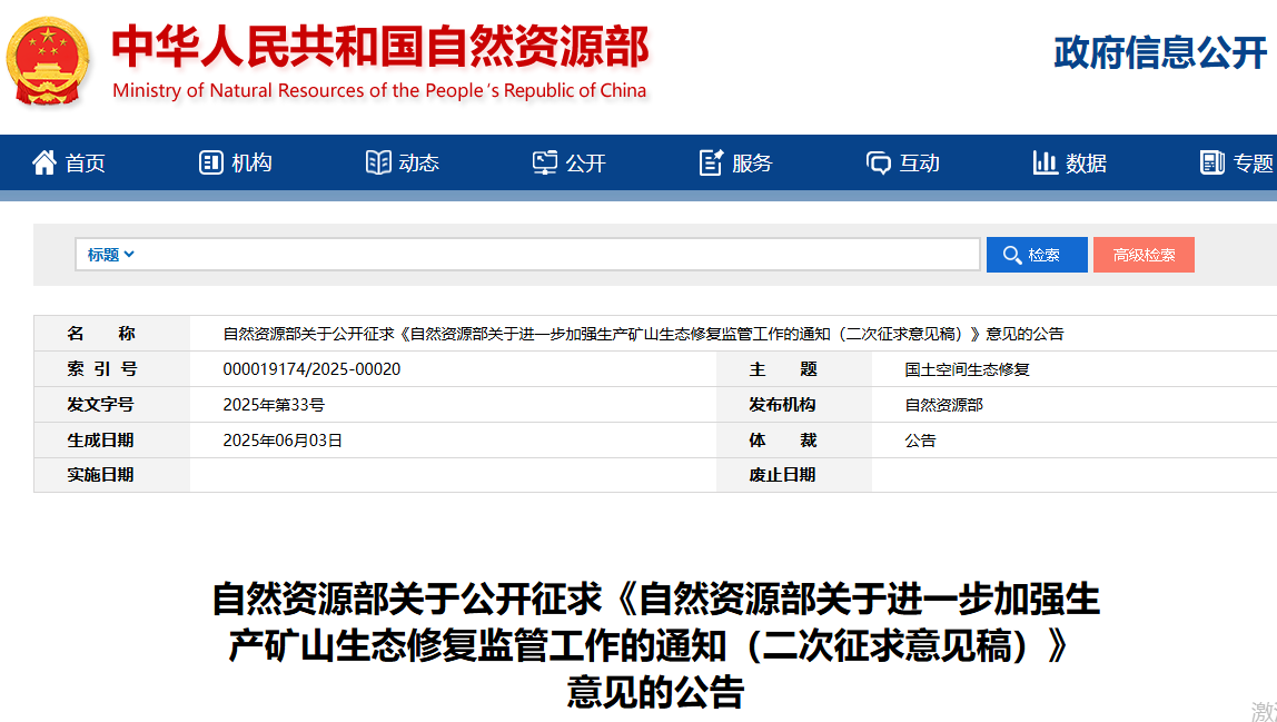 為貫徹落實(shí)新修訂的《礦產(chǎn)資源法》和《土地管理法》《土地復(fù)墾條例》等法律法規(guī),學(xué)習(xí)運(yùn)用習(xí)近平生態(tài)文明思想“廈門(mén)實(shí)踐”經(jīng)驗(yàn),壓實(shí)采礦權(quán)人生態(tài)保護(hù)修復(fù)主體責(zé)任,推動(dòng)落實(shí)“邊開(kāi)采、邊修復(fù)”要求,促進(jìn)資源開(kāi)發(fā)與生態(tài)環(huán)境保護(hù)相協(xié)調(diào),助力礦業(yè)綠色低碳發(fā)展,自然資源部在征求各方意見(jiàn)的基礎(chǔ)上,起草形成《自然資源部關(guān)于進(jìn)一步加強(qiáng)生產(chǎn)礦山生態(tài)修復(fù)監(jiān)管工作的通知(二征求意見(jiàn)稿)》,現(xiàn)再次向社會(huì)公開(kāi)征求意見(jiàn)。征求意見(jiàn)截止時(shí)間為公告發(fā)布后15日。有關(guān)意見(jiàn)建議可通過(guò)以下兩種方式反饋: