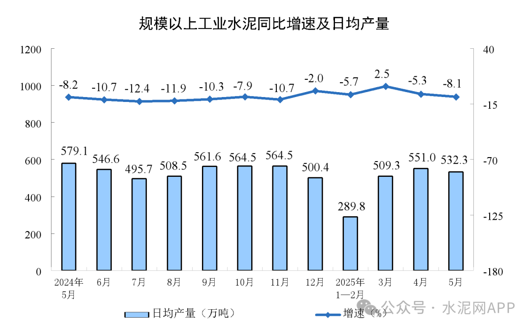 6月16日,國家統(tǒng)計局公布了5月份國民經(jīng)濟相關(guān)數(shù)據(jù)。5月份,規(guī)模以上工業(yè)增加值同比實際增長5.8%(增加值增速均為扣除價格因素的實際增長率)。從環(huán)比看,5月份,規(guī)模以上工業(yè)增加值比上月增長0.61%。1—5月份,規(guī)模以上工業(yè)增加值同比增長6.3%。其中5月份水泥產(chǎn)量16500萬噸,同比下降8.1%;1-5月份水泥產(chǎn)量65939萬噸,同比下降4%。此外,數(shù)據(jù)顯示,2024年1-5月全國水泥產(chǎn)量為68727萬噸,由此計算,今年1-5月水泥全口徑產(chǎn)量比去年同期減少2788萬噸,降幅4.06%。