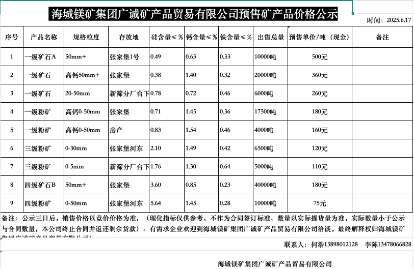 海城鎂礦集團(tuán)廣誠(chéng)礦產(chǎn)品貿(mào)易有限公司預(yù)售礦產(chǎn)品價(jià)格公示