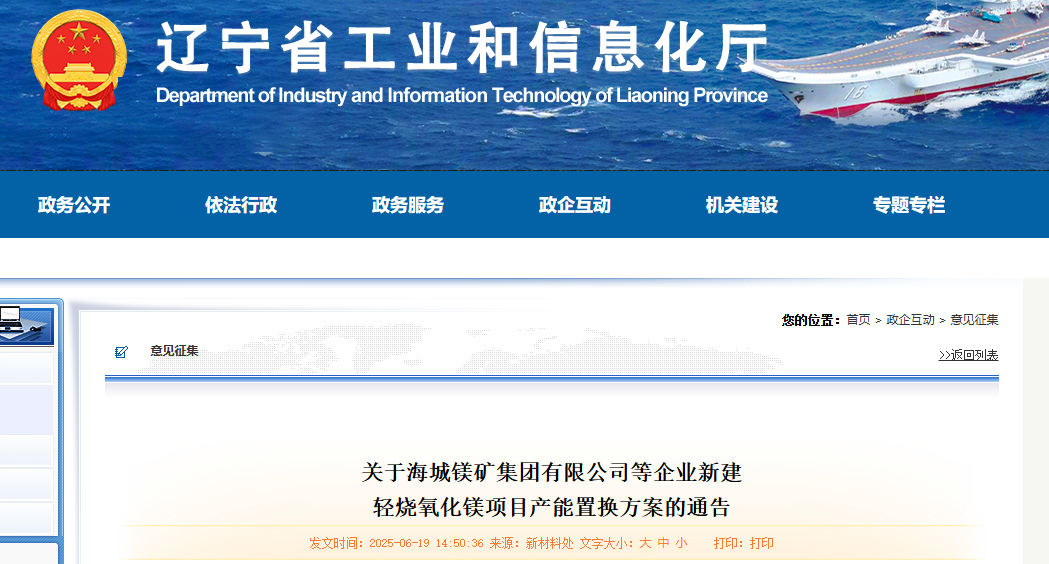 按照《遼寧省人民政府辦公廳關(guān)于推進菱鎂行業(yè)高質(zhì)量發(fā)展的實施意見》(遼政辦發(fā)〔2023〕15號)、《遼寧省菱鎂礦浮選及鎂砂行業(yè)產(chǎn)能置換辦法》(遼工信建材〔2024〕18號)要求,根據(jù)菱鎂行業(yè)專項整治工作進展,經(jīng)企業(yè)申請、市級審核、省級復(fù)核,我廳于2025年6月5日至6月18日,對海城鎂礦集團有限公司等企業(yè)新建輕燒氧化鎂項目產(chǎn)能置換方案進行了公示,公示期間無異議,現(xiàn)予通告。