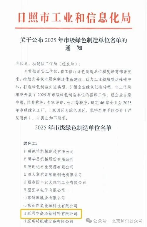 近日,日照市工業(yè)和信息化局公布了2025年市級綠色制造單位,日照利爾高溫新材料有限公司被評為綠色工廠。