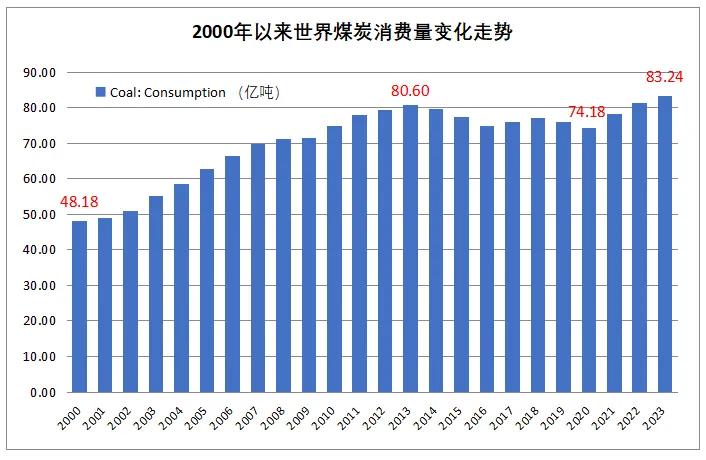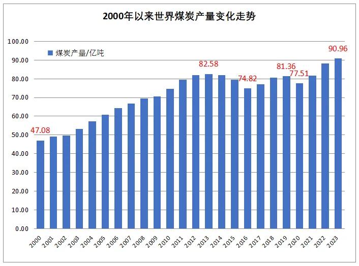 統(tǒng)計年鑒數(shù)據(jù)顯示,2023年,世界煤炭總產(chǎn)量為90.957億噸(179.24艾焦耳),比2022年增長3.1%,全球產(chǎn)量首次突破90億噸,創(chuàng)出歷史新紀(jì)錄。