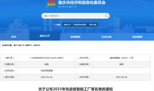 6月24日,重慶市經(jīng)信委發(fā)布“關(guān)于公布2025年先進(jìn)級(jí)智能工廠等名單的通知”。
