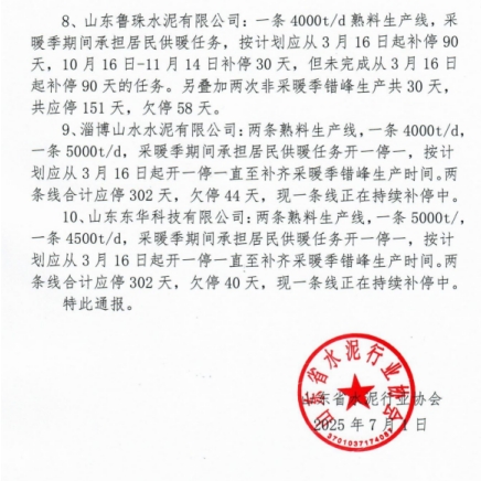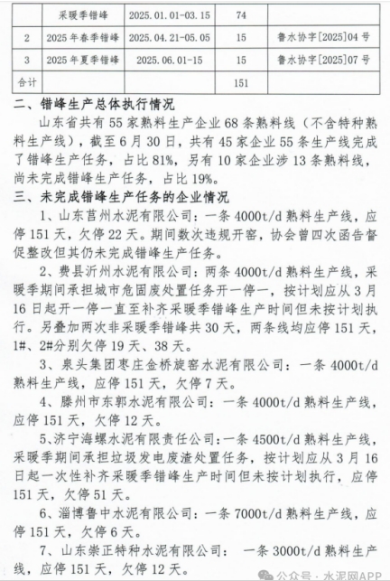 近日,山東省水泥行業(yè)協(xié)會(huì)發(fā)布“關(guān)于水泥熟料企業(yè)錯(cuò)峰生產(chǎn)執(zhí)行情況通報(bào)”稱,山東省共有55家熟料生產(chǎn)企業(yè)68條熟料線(不含特種熟料生產(chǎn)線),截至6月30日,共有45家企業(yè)55條生產(chǎn)線完成了錯(cuò)峰生產(chǎn)任務(wù),占比81%,另有10家企業(yè)涉13條熟料線,尚未完成錯(cuò)峰生產(chǎn)任務(wù),占比19%。全文如下: