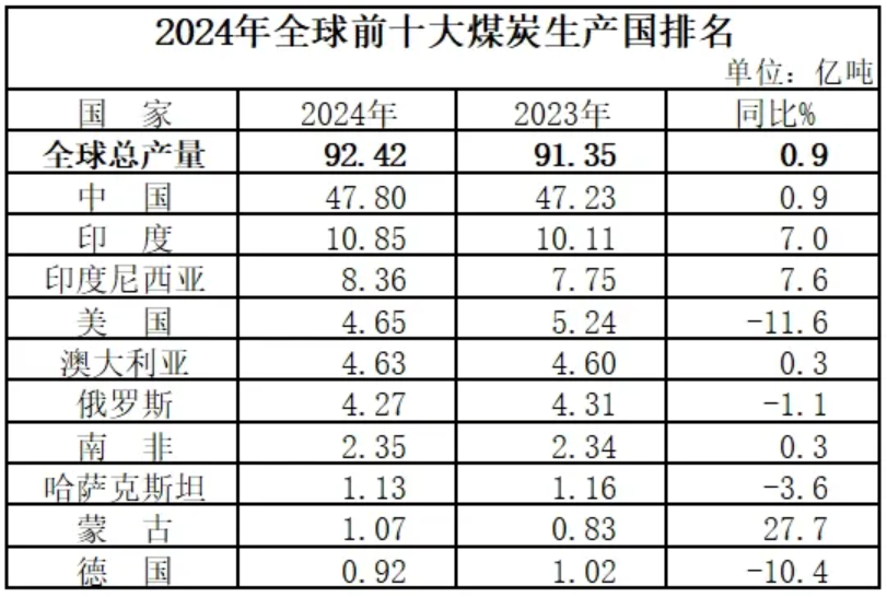 根據(jù)《年鑒》,2024年,中國(guó)煤炭產(chǎn)量47.8億噸,同比增長(zhǎng)0.9%,占全球總產(chǎn)量的51.7%。煤炭產(chǎn)量?jī)|噸以上的國(guó)家為9個(gè),分別為,中國(guó)、印度、印度尼西亞、美國(guó)、澳大利亞、俄羅斯、南非、哈薩克斯坦、蒙古國(guó)。其中,蒙古國(guó)產(chǎn)量首次過(guò)億噸,且增幅最大,達(dá)27.7%,中國(guó)、印度、印度尼西亞、澳大利亞和南非煤炭產(chǎn)量較上年有所增加。