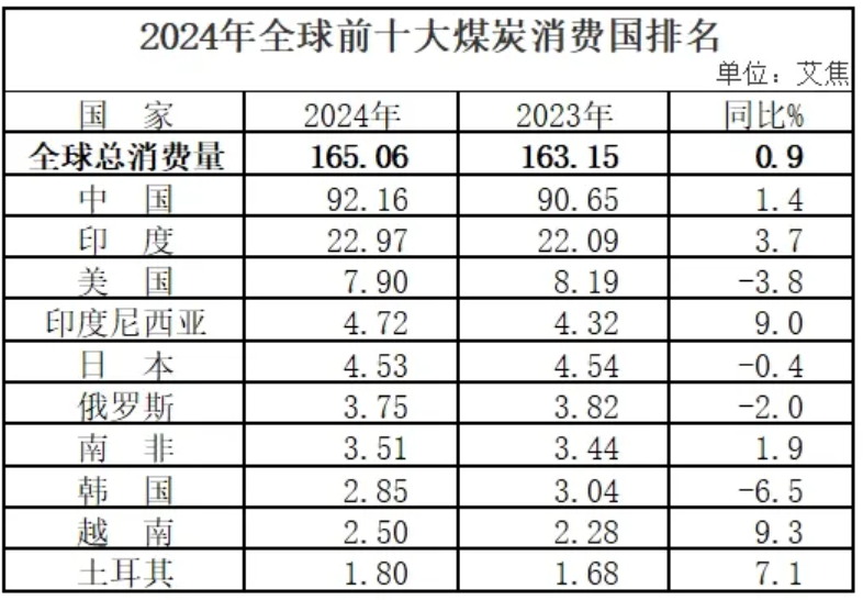 2024年,中國(guó)煤炭消費(fèi)量為92.16艾焦(EJ),同比增長(zhǎng)1.4%,占全球總消費(fèi)量的55.8%。消費(fèi)量排名前十的國(guó)家分別為:中國(guó)、印度、美國(guó)、印度尼西亞、日本、俄羅斯、南非、韓國(guó)、越南和土耳其。其中,中國(guó)、印度、印度尼西亞、南非、越南和土耳其煤炭消費(fèi)量較上年有所增加。