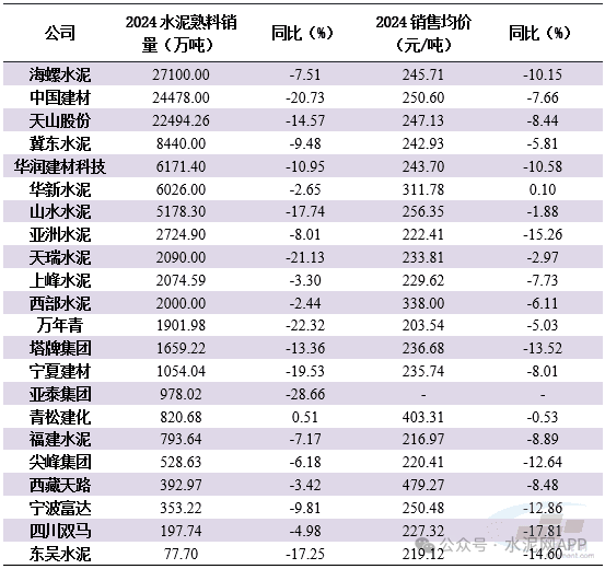 表2:2024主要水泥上市公司水泥熟料銷售和均價(jià)情況