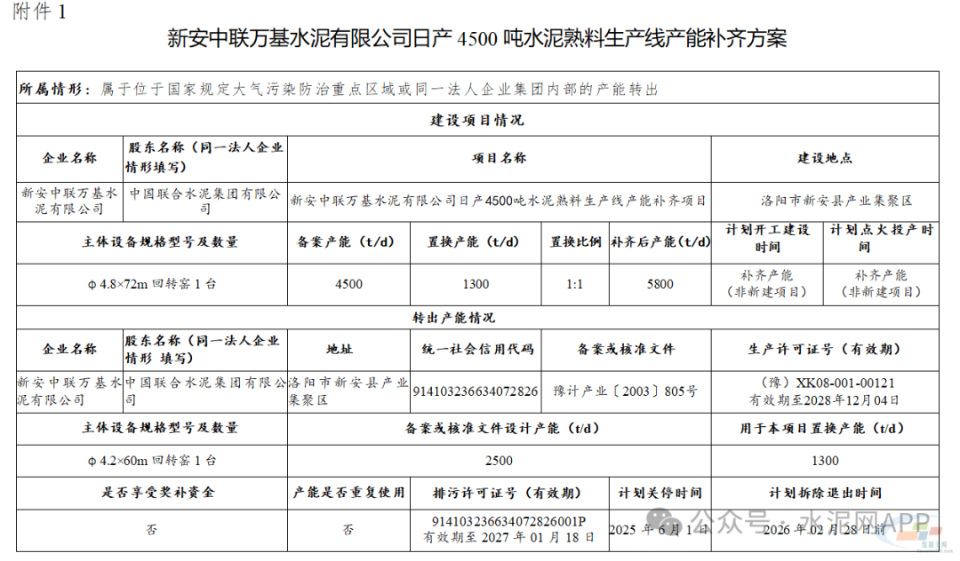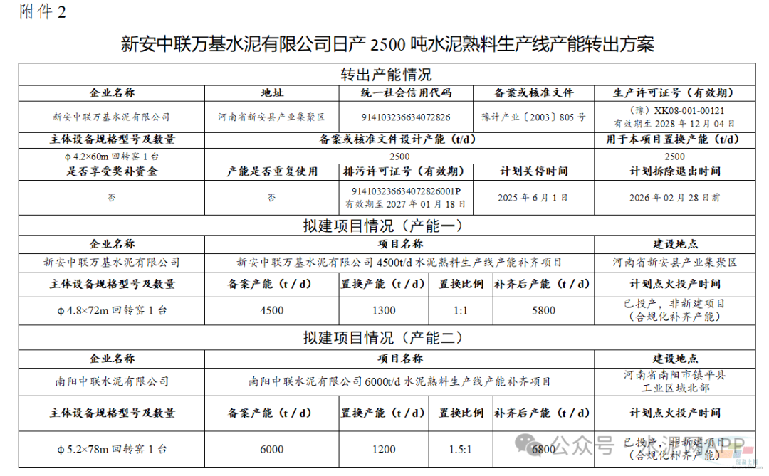 置換產(chǎn)能來自新安中聯(lián)萬基水泥有限公司2500t/d水泥熟料生產(chǎn)線(用于本項目置換產(chǎn)能1300t/d)。