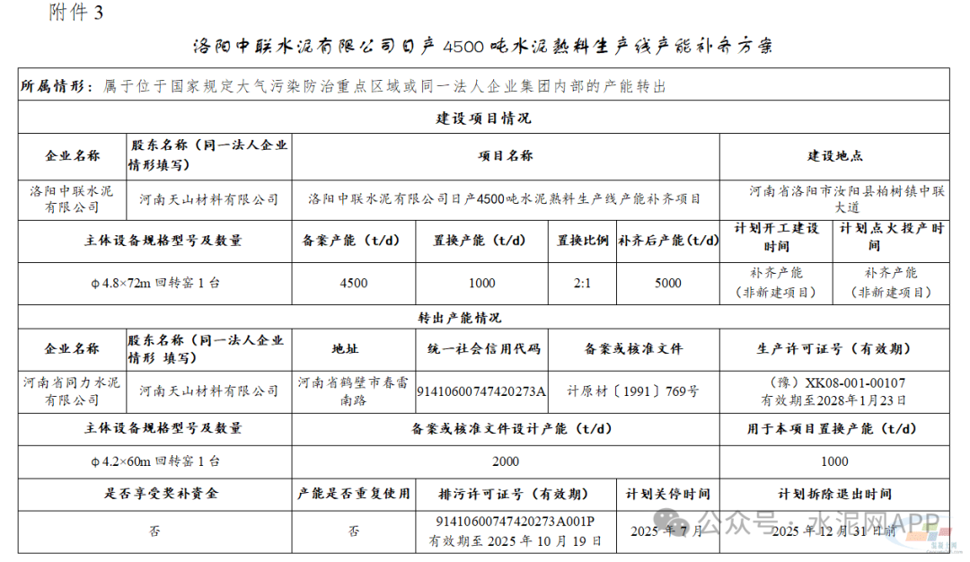 置換產(chǎn)能來自河南省同力水泥有限公司2000t/d熟料生產(chǎn)線(用于本項目置換產(chǎn)能1000t/d)。