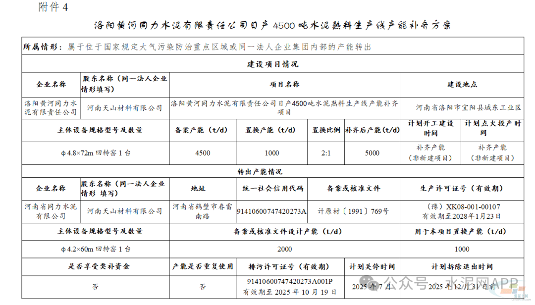 3、洛陽黃河同力水泥有限責任公司日產(chǎn)4500噸水泥熟料生產(chǎn)線產(chǎn)能補齊方案:備案產(chǎn)能4500t/d,置換產(chǎn)能1000t/d,置換比例2:1,補齊后產(chǎn)能5000t/d。