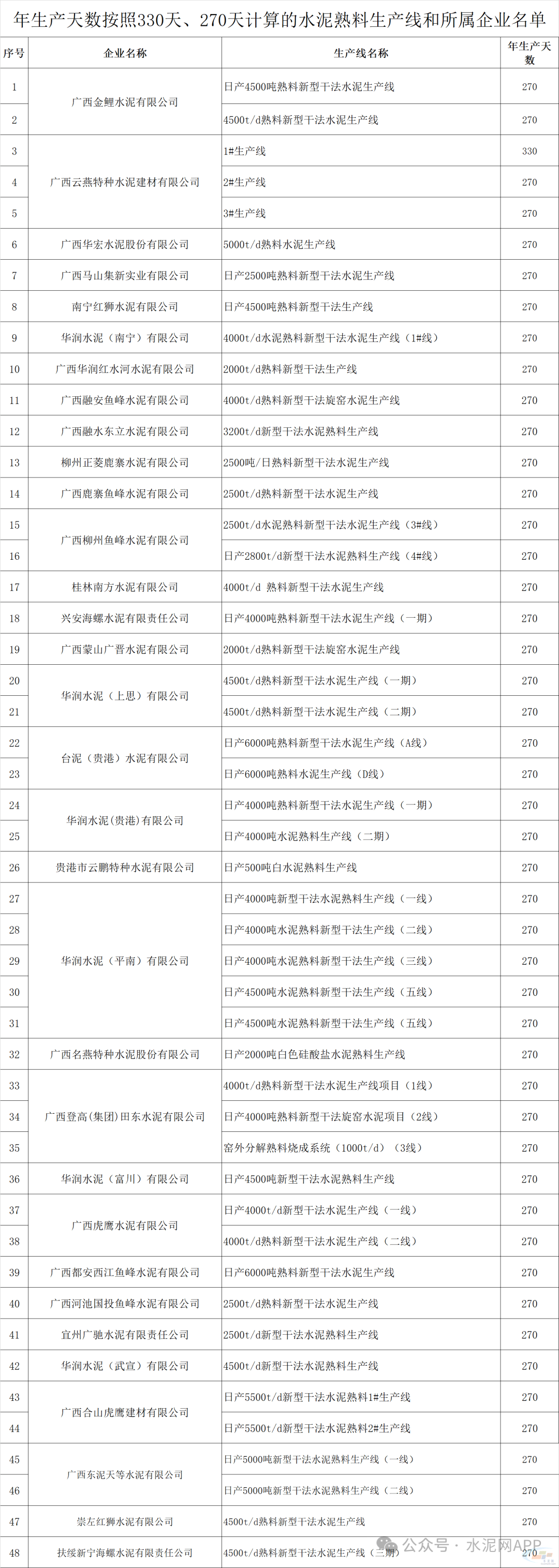 近日,廣西壯族自治區(qū)工業(yè)和信息化廳發(fā)布《關(guān)于年生產(chǎn)天數(shù)按照330天、270天計算的水泥熟料生產(chǎn)線名單的公示》。根據(jù)公示,廣西壯族自治區(qū)按照330天、270天計算的水泥熟料生產(chǎn)線和所屬企業(yè)名單中共計48條水泥熟料生產(chǎn)線,其中,廣西云燕特種水泥建材有限公司1#生產(chǎn)線年生產(chǎn)天數(shù)按照330天計算,其余47條水泥熟料生產(chǎn)線年生產(chǎn)天數(shù)按照270天計算。