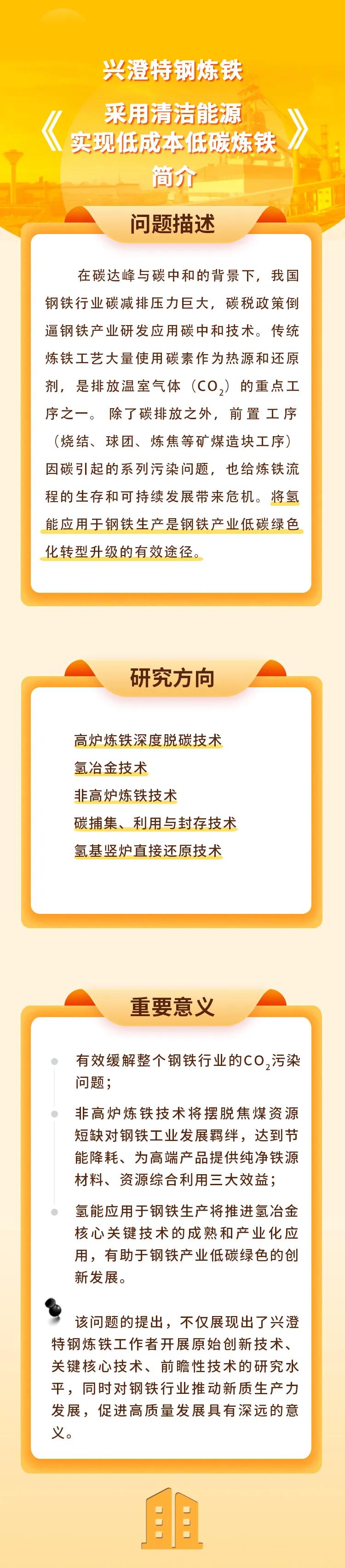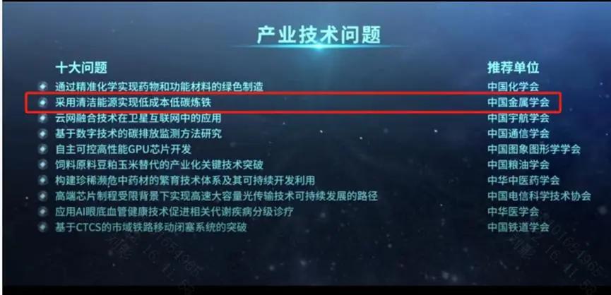 7月2日,在第二十六屆中國科協(xié)年會主論壇上,中國科協(xié)發(fā)布了2024年度重大科學(xué)問題、工程技術(shù)難題和產(chǎn)業(yè)技術(shù)問題目錄。興澄特鋼煉鐵事業(yè)部提報的“采用清潔能源實現(xiàn)低成本低碳煉鐵”項目被遴選為2024十大產(chǎn)業(yè)技術(shù)問題,成為鋼鐵行業(yè)唯一。