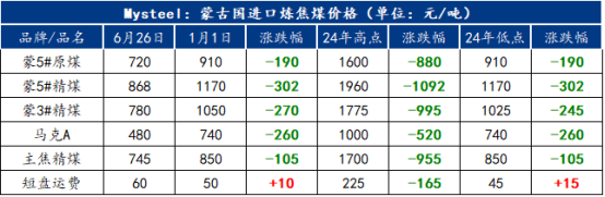 國(guó)內(nèi)雙焦市場(chǎng)弱勢(shì)運(yùn)行,進(jìn)口蒙古國(guó)煉焦煤隨之下跌,口岸各煤種銷(xiāo)售價(jià)格從年初高位逐月下滑,現(xiàn)已接近貿(mào)易企業(yè)成本線,但短盤(pán)運(yùn)費(fèi)、監(jiān)管區(qū)倉(cāng)儲(chǔ)等固定成本費(fèi)用變化不大,口岸貿(mào)易企業(yè)利潤(rùn)空間不斷受到擠壓。部分企業(yè)近期暫停拉運(yùn),轉(zhuǎn)向消化監(jiān)管區(qū)現(xiàn)有庫(kù)存,等待三季度市場(chǎng)行情。截止6月26日甘其毛都口岸蒙5#原煤口岸提貨含稅價(jià)720元/噸,環(huán)比年初下跌190元/噸;蒙5#精煤烏不浪口金泉工業(yè)園區(qū)含稅價(jià)868元/噸,環(huán)比年初下跌302元/噸;甘其毛都口岸蒙3#精煤口岸提貨含稅價(jià)780元/噸,環(huán)比年初下跌270元/噸;策克口岸馬克A原煤含稅價(jià)480元/噸,環(huán)比年初下跌260元/噸;滿都拉主焦精煤含稅價(jià)745元/噸,環(huán)比年初下跌105元/噸。但與之對(duì)應(yīng)的甘其毛都口岸短盤(pán)運(yùn)費(fèi)60元/噸,環(huán)比年初上漲10元/噸。
