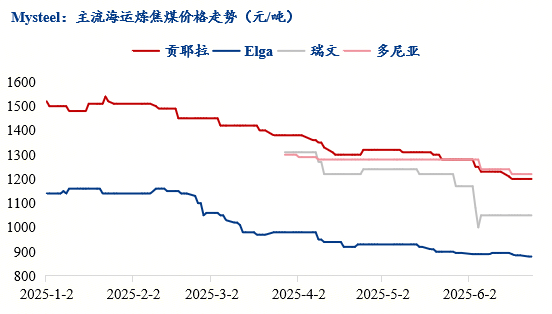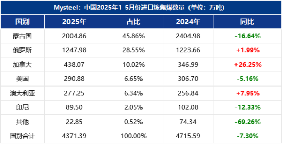 據(jù)海關(guān)總署最新數(shù)據(jù)顯示,截止5月底,2025年中國(guó)進(jìn)口量煉焦煤總計(jì)4371.39萬(wàn)噸,同比下降7.3%?。其中,蒙古國(guó)作為我國(guó)進(jìn)口煤的主要來(lái)源國(guó),減量尤為明顯,年同比下降16.64%(-400.12萬(wàn)噸)。2025年初三大口岸過(guò)貨量目標(biāo)增長(zhǎng)至8100萬(wàn)噸,較2024年過(guò)貨量目標(biāo)增長(zhǎng)15.71%,較2024年實(shí)際完成過(guò)貨量增長(zhǎng)8.0%。過(guò)貨目標(biāo)增加導(dǎo)致口岸監(jiān)管區(qū)周轉(zhuǎn)壓力明顯,庫(kù)存持續(xù)高位,1月底至4月底連續(xù)三個(gè)月庫(kù)存在400萬(wàn)噸以上,最高值超460萬(wàn)噸,超出核定庫(kù)容32%。監(jiān)管區(qū)周轉(zhuǎn)壓力導(dǎo)致通關(guān)過(guò)貨不增反降,6月底甘其毛都口岸監(jiān)管區(qū)庫(kù)存再度突破至410萬(wàn)噸附近,貿(mào)易企業(yè)拉運(yùn)積極性不足,下半年蒙煤供應(yīng)難有大幅增長(zhǎng)。根據(jù)Mysteel數(shù)據(jù),截止2025年5月底進(jìn)口焦煤總量達(dá)到4371.39萬(wàn)噸左右,其中海運(yùn)煉焦煤進(jìn)口2366.53萬(wàn)噸,年同比微增2.42%左右,其中俄煤占據(jù)海運(yùn)煉焦煤總量的52.73%。美國(guó)焦煤進(jìn)口量第一季度并未顯示出頹勢(shì),主要還是由于前期搶進(jìn)口及國(guó)內(nèi)進(jìn)口關(guān)稅的靈活期導(dǎo)致到港量維持相對(duì)高位,但是到二季度進(jìn)口量開(kāi)始下行。而我國(guó)國(guó)內(nèi)貿(mào)易環(huán)節(jié)認(rèn)為美國(guó)焦煤進(jìn)口在28%的進(jìn)口關(guān)稅水平下仍然難改進(jìn)口頹勢(shì),在5月份進(jìn)口量歸零。澳大利亞、加拿大的進(jìn)口焦煤資源也因?yàn)橹袊?guó)一直為其機(jī)會(huì)市場(chǎng),并沒(méi)有大范圍向我國(guó)發(fā)運(yùn),雖然加拿大、澳大利亞焦煤同比增加26.25%、7.95%,但是此兩者未能有效彌補(bǔ)美國(guó)焦煤進(jìn)口暫歇形成的缺口。而從進(jìn)口海運(yùn)焦煤到港情況可以看出,俄羅斯主流礦山增加對(duì)我國(guó)國(guó)內(nèi)長(zhǎng)協(xié)供應(yīng),4-5月其已經(jīng)重新回到海運(yùn)焦煤到港量的頭部位置,每周到港量達(dá)到40-50萬(wàn)噸左右。加拿大及澳大利亞焦煤資源到港波動(dòng)性更強(qiáng),源于國(guó)內(nèi)貿(mào)易及終端定期采買(mǎi)量有限、其礦山事故停產(chǎn)、且受到船運(yùn)周期較長(zhǎng)等因素影響到港。綜合全年來(lái)看,2025年中國(guó)進(jìn)口煉焦煤總量或?yàn)?.05億噸,同比減少1600萬(wàn)噸左右。