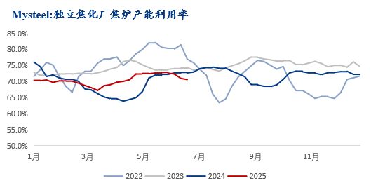 上半年煉焦煤需求維持相對(duì)高位,但顯性補(bǔ)庫(kù)需求較弱,下游煉焦煤持續(xù)去庫(kù)趨勢(shì),始終保持低庫(kù)存采購(gòu)策略。原料煤價(jià)格持續(xù)讓利下,焦企仍保持高位生產(chǎn)。2025上半年Mysteel全國(guó)獨(dú)立焦企開(kāi)工率73.42%同比增3.9%,增幅較為明顯Mysteel鋼廠焦企開(kāi)工86.9%同比下移0.21%,弱穩(wěn)運(yùn)行。從獨(dú)立焦企看,上半年獨(dú)立焦企開(kāi)工較為平穩(wěn)保持小幅上升趨勢(shì),華北焦企用煤消耗高于去年同期水平,華東以及東北區(qū)域焦企開(kāi)工率低于去年同期,疊加區(qū)域性用煤結(jié)構(gòu)或有差異,華北焦企庫(kù)存普遍低于去年同期水平。鋼廠焦企原料煤庫(kù)存相對(duì)平穩(wěn),生產(chǎn)節(jié)奏較為穩(wěn)定。上半年用煤消耗不減,低庫(kù)存采購(gòu)仍能平衡生產(chǎn)端,中間環(huán)節(jié)需求量流動(dòng)下較差,上半年煉焦煤需求對(duì)價(jià)格難有明顯驅(qū)動(dòng)。下半年煉焦煤市場(chǎng)核心矛盾是對(duì)需求考驗(yàn),從宏觀經(jīng)濟(jì),基建房地產(chǎn)仍有調(diào)控優(yōu)化政策出臺(tái)預(yù)期,政策環(huán)境以及方向仍相對(duì)友好,其次關(guān)稅貿(mào)易變化仍有具有不確定性,對(duì)市場(chǎng)情緒端仍有擾動(dòng)。從下游需求看,鋼材出口市場(chǎng)轉(zhuǎn)弱以及疊加行政減產(chǎn)仍是不確定對(duì)原料仍有一定壓制。從焦化廠用煤采購(gòu)看,下游仍受季節(jié)性影響,或推動(dòng)結(jié)構(gòu)性補(bǔ)庫(kù)需求,當(dāng)下下游庫(kù)存處于絕對(duì)低位,市場(chǎng)價(jià)格吻合預(yù)期下,不排除會(huì)有間接性補(bǔ)庫(kù)信號(hào)顯現(xiàn)。下半年從焦化廠產(chǎn)能釋放和投產(chǎn)看,下半年凈新增產(chǎn)能1459萬(wàn)噸,主要分布山西、內(nèi)蒙等區(qū)域,如按期投產(chǎn)對(duì)原料煤實(shí)際消耗有效果增加。從利潤(rùn)看需求,總體看下半年煉焦煤市場(chǎng)邊際需求或有減弱,季度性備庫(kù)需求和新增產(chǎn)能主導(dǎo)是否能夠有效帶動(dòng)需求轉(zhuǎn)化,需求的風(fēng)險(xiǎn)更多集中在下游焦企利潤(rùn)進(jìn)一步擠兌后的主動(dòng)減產(chǎn)力度以及鋼材出口轉(zhuǎn)弱風(fēng)險(xiǎn)對(duì)原料煤形成負(fù)反饋。