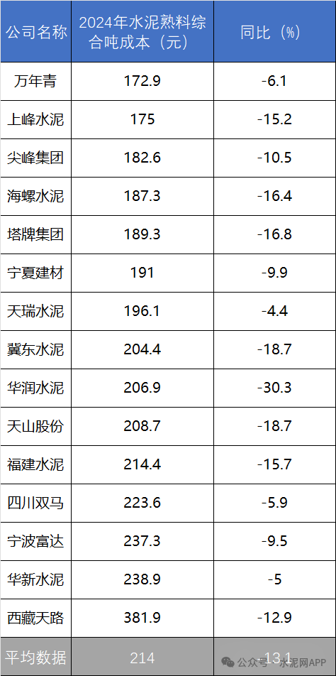 中國水泥網(wǎng)根據(jù)目前滬深和香港上市公司年報(bào)分析了各水泥企業(yè)相關(guān)數(shù)據(jù),下面僅從生產(chǎn)成本角度分析,誰的水泥熟料綜合生產(chǎn)成本更低?生產(chǎn)成本低也意味著誰在市場上競爭力更強(qiáng)。下面就根據(jù)相關(guān)數(shù)據(jù)分析下24年度水泥企業(yè)生產(chǎn)成本情況(水泥熟料綜合生產(chǎn)成本指對外銷售的水泥和熟料合計(jì)數(shù)據(jù),部分企業(yè)還包含海外數(shù)據(jù),以下簡稱噸生產(chǎn)成本)。