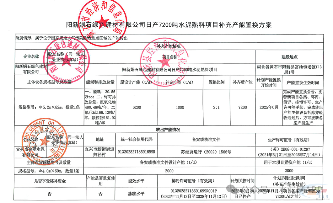 置換方案顯示,陽(yáng)新媧石綠色建材有限公司日產(chǎn)6200噸水泥熟料生產(chǎn)線補(bǔ)充產(chǎn)能1000t/d,補(bǔ)齊后產(chǎn)能7200t/d。退出產(chǎn)能來自宜興市金墅水泥有限公司2000t/d水泥熟料生產(chǎn)線,置換比例為2:1。