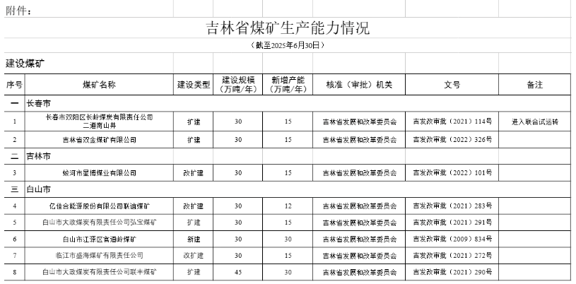 吉林省能源局關于2025年上半年煤礦產能情況的通告