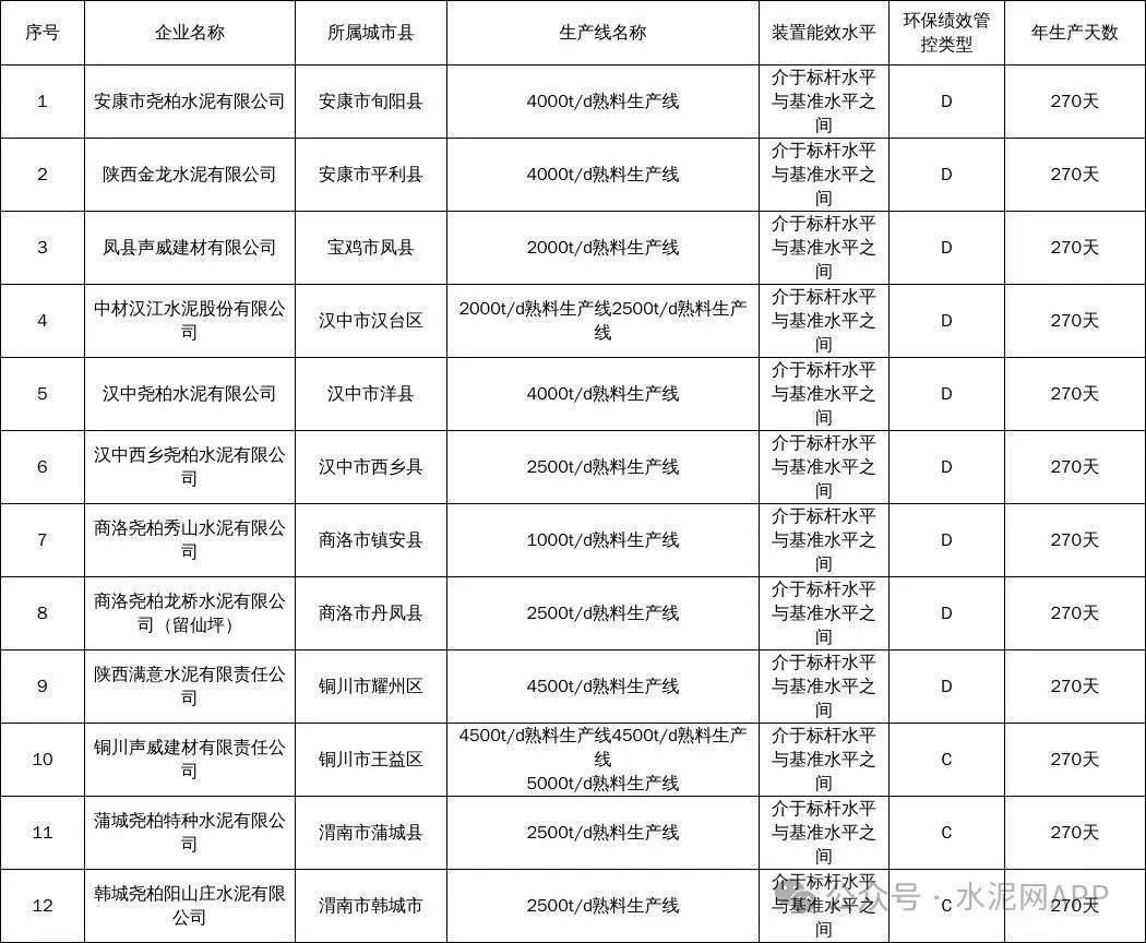 公告顯示,陜西省共12條水泥熟料生產(chǎn)線生產(chǎn)時間按270計(jì)算,具體見下表: