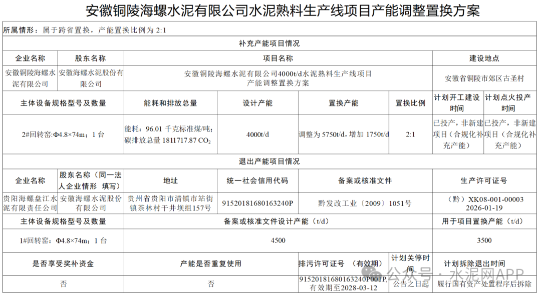 置換方案顯示,安徽銅陵海螺水泥有限公司4000t/d水泥熟料生產(chǎn)線產(chǎn)能調(diào)整為5750t/d,補(bǔ)充1750t/d熟料產(chǎn)能。