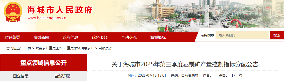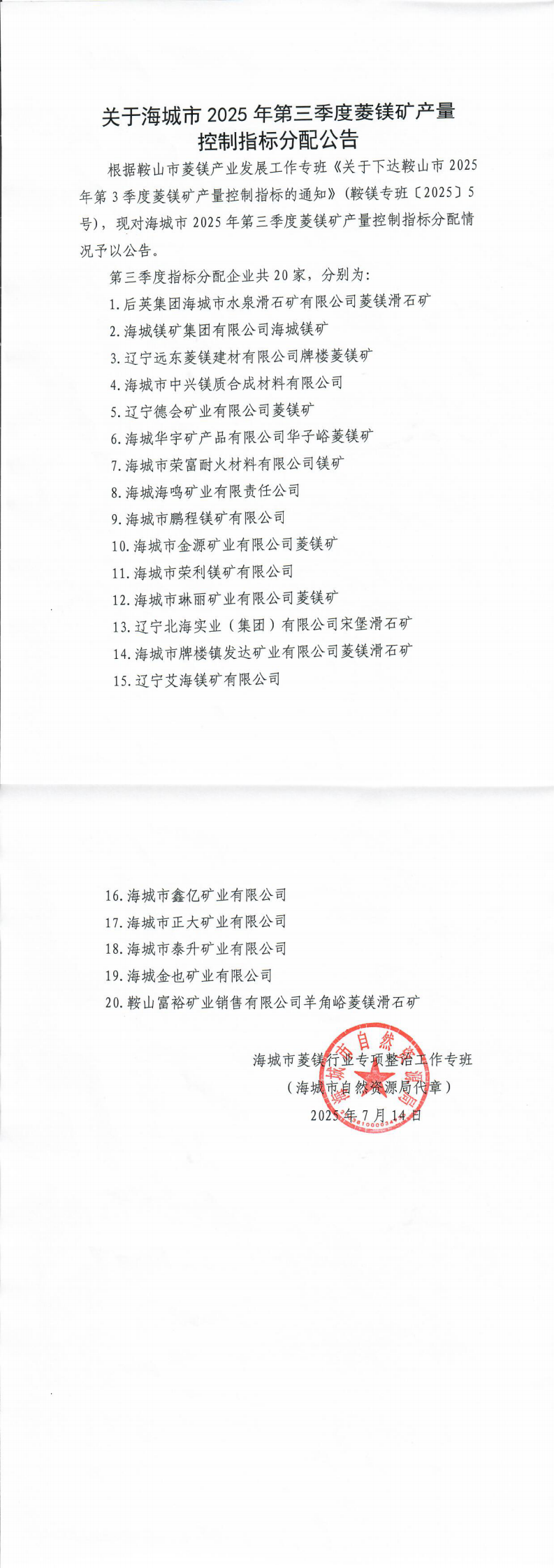 關(guān)于海城市2025年第三季度菱鎂礦產(chǎn)量控制指標分配公告