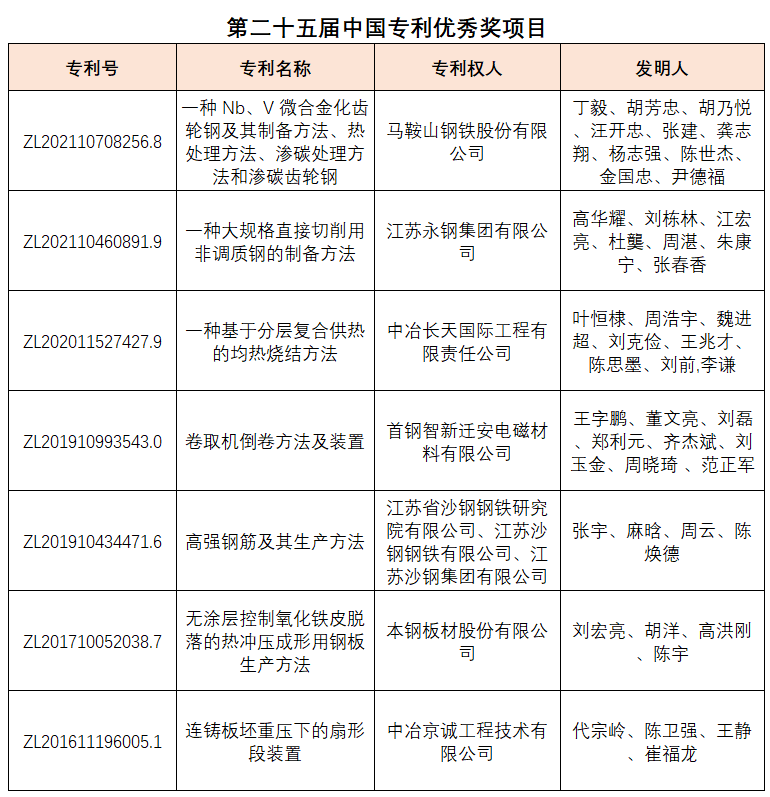 近日,國家知識產(chǎn)權(quán)局發(fā)布《國家知識產(chǎn)權(quán)局關(guān)于第二十五屆中國專利獎授獎的決定》。第二十五屆中國專利獎共評選出中國專利金獎獲獎項目30項,中國外觀設計金獎獲獎項目10項,中國專利銀獎獲獎項目60項,中國外觀設計銀獎獲獎項目15項,中國專利優(yōu)秀獎獲獎項目607項,中國外觀設計優(yōu)秀獎獲獎項目47項。鋼鐵相關(guān)領域7項專利榮獲第二十五屆中國專利優(yōu)秀獎,名單如下:
