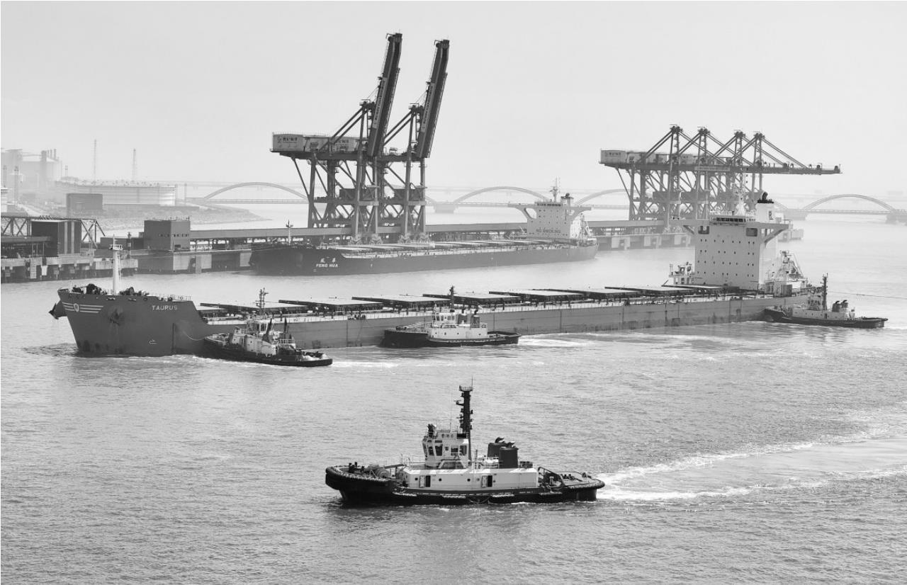從河北省唐山市海洋口岸和港航管理局獲悉,今年1至6月份,唐山港全港完成貨物吞吐量43356萬噸,同比增長0.75%。圖為7月18日,輪船在拖輪的協(xié)助下向唐山港曹妃甸港區(qū)礦石碼頭靠泊(無人機照片)。