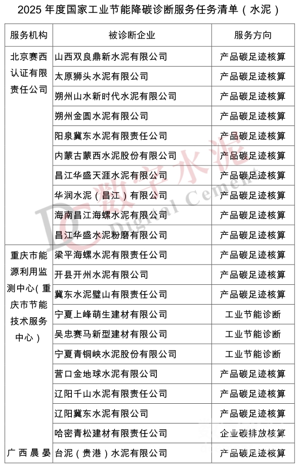 其中,水泥行業(yè)2025年度國家工業(yè)節(jié)能降碳診斷服務(wù)任務(wù)清單整理如下:
