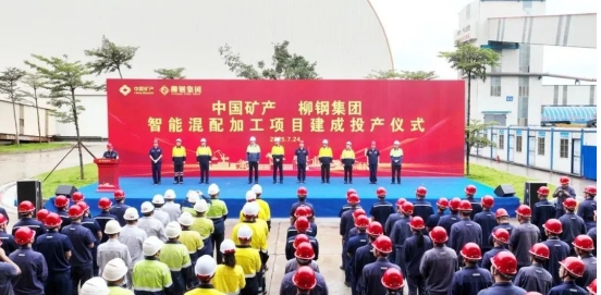 柳鋼集團攜手央企中國礦產(chǎn)合資合作建設的國鏈廣西智能混配加工項目投產(chǎn)儀式現(xiàn)場。