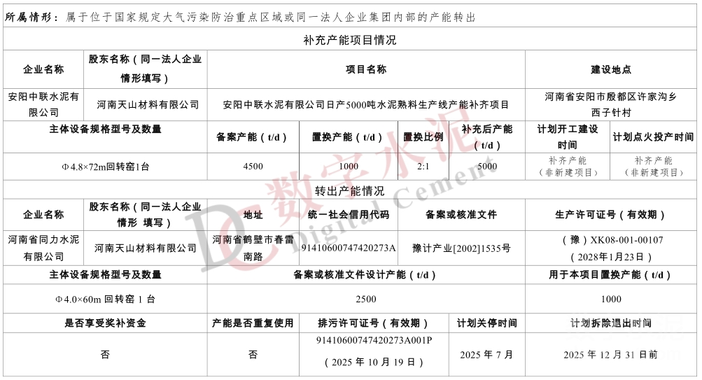 根據(jù)公示,安陽(yáng)中聯(lián)水泥有限公司日產(chǎn)4500噸水泥熟料生產(chǎn)線備案產(chǎn)能為4500t/d,置換產(chǎn)能1000t/d,置換比例為2:1,補(bǔ)充后產(chǎn)能為5000t/d。轉(zhuǎn)出產(chǎn)能來(lái)自河南省同力水泥有限公司2500t/d熟料生產(chǎn)線中的1000t/d,計(jì)劃2025年12月31日前拆除退出。