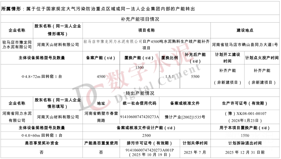 駐馬店市豫龍同力水泥有限公司日產(chǎn)4500噸水泥熟料生產(chǎn)線備案產(chǎn)能為4500t/d,置換產(chǎn)能1500t/d,補(bǔ)充后產(chǎn)能為5500t/d,置換比例為1.5:1。轉(zhuǎn)出產(chǎn)能來(lái)自河南省同力水泥有限公司2500t/d水泥熟料生產(chǎn)線中的1500t/d,計(jì)劃2025年12月31日前拆除退出。