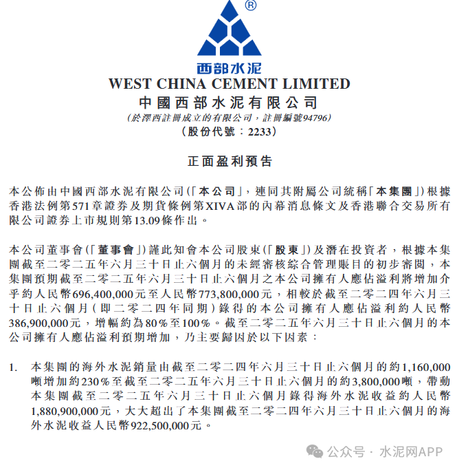 公司海外水泥銷量去年上半年約為116萬噸,今年上半年約為380萬噸,同比增加約230%。上半年,公司銷售物業(yè)獲得利潤約為9770萬元。