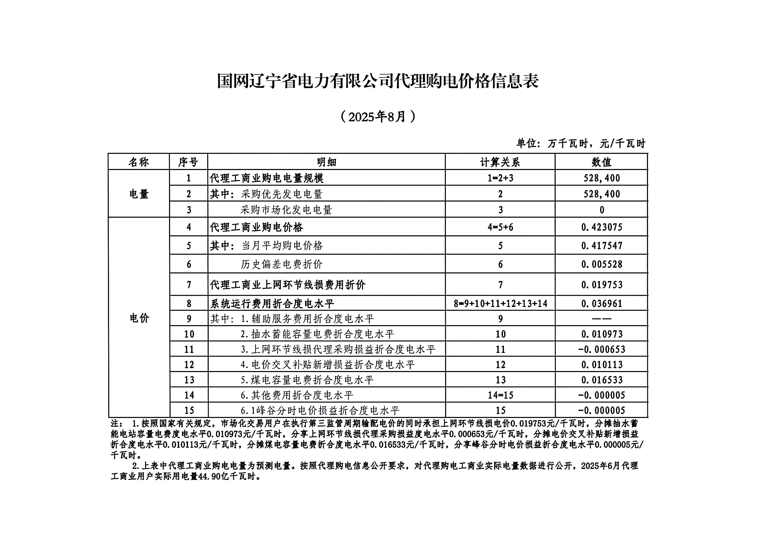 國(guó)網(wǎng)遼寧省電力有限公司代理購(gòu)電工商業(yè)用戶電價(jià)表(2025年8月)
