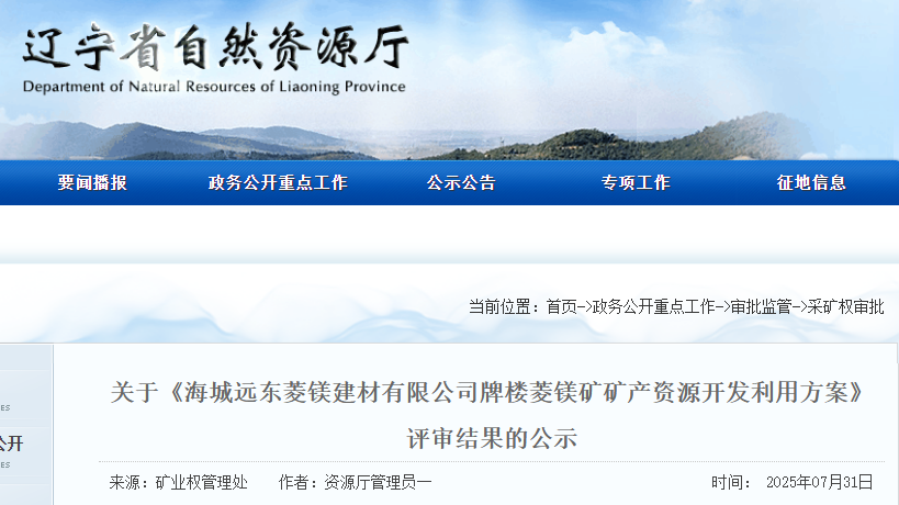 根據(jù)《自然資源部辦公廳關(guān)于印發(fā)礦產(chǎn)資源(非油氣)開發(fā)利用方案編制指南的通知》(自然資辦發(fā)〔2024〕33號)、《關(guān)于印發(fā) <遼寧省省級礦產(chǎn)資源勘查實施方案和開發(fā)利用方案評審工作規(guī)范(試行)> 的通知》(遼自然資辦發(fā) 〔2024〕81號)等相關(guān)規(guī)定,遼寧省自然資源事務(wù)服務(wù)中心組織專家對《海城遠(yuǎn)東菱鎂建材有限公司牌樓菱鎂礦礦產(chǎn)資源開發(fā)利用方案》進(jìn)行了審查,該方案已通過專家審查,現(xiàn)將審查結(jié)果予以公示。