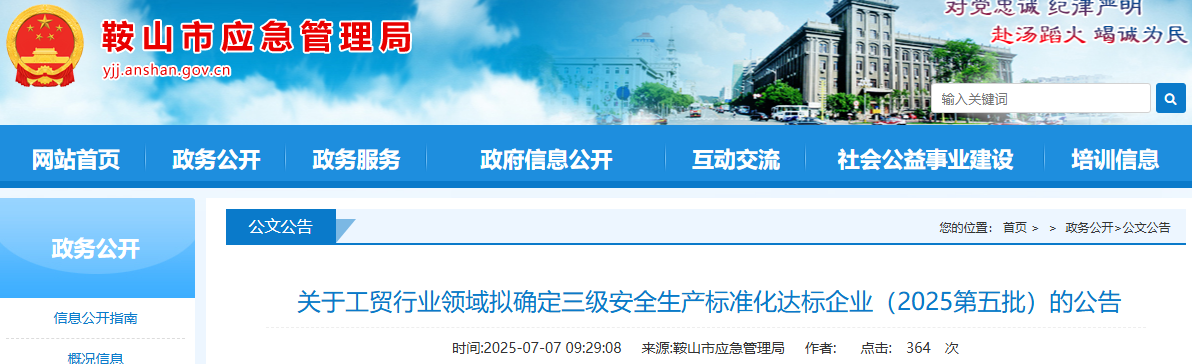 根據(jù)《應急管理部關于印發(fā)<企業(yè)安全生產(chǎn)標準化建設定級辦法>的通知》(應急〔2021〕83號)《遼寧省應急管理廳關于印發(fā)<遼寧省工貿(mào)企業(yè)安全生產(chǎn)標準化實施辦法>的通知》(遼應急規(guī)范〔2022〕3號)《鞍山市應急管理局關于印發(fā)<鞍山市應急管理局安全生產(chǎn)標準化建設工作辦法>的通知》(鞍應急發(fā)〔2023〕51號)等文件規(guī)定,經(jīng)企業(yè)自評、申請、評審、復審、公示等程序,確定鞍山市新迪爐業(yè)耐火材料有限公司、海城市后英興東耐火材料有限公司、遼寧乾峰建筑工程有限公司、鞍山市和豐耐火材料有限公司、臺安縣欣鑫礦產(chǎn)品加工有限公司、鞍山熱能滑動機械有限責任公司和遼寧俊龍耐火材料有限公司,共七家為工貿(mào)行業(yè)安全生產(chǎn)標準化三級企業(yè),有效期自公告之日起3年。