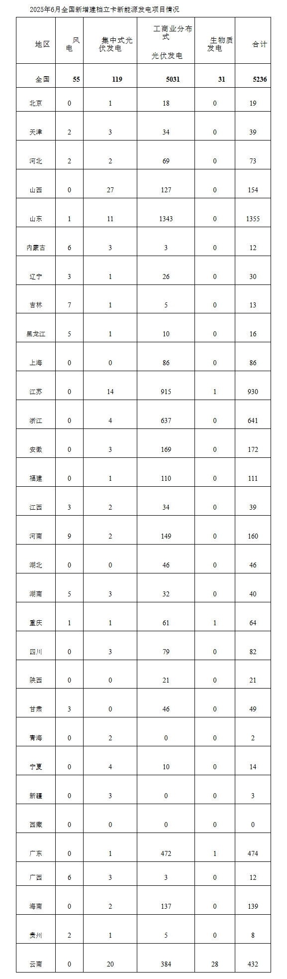 據(jù)國家能源局網(wǎng)站消息,國家能源局發(fā)布《關(guān)于2025年6月全國新增建檔立卡新能源發(fā)電(不含戶用光伏)項(xiàng)目情況的公告》。2025年6月,全國新增建檔立卡新能源發(fā)電(不含戶用光伏)項(xiàng)目共5236個(gè),其中風(fēng)電項(xiàng)目55個(gè),光伏發(fā)電項(xiàng)目5150個(gè)(集中式光伏發(fā)電項(xiàng)目119個(gè),工商業(yè)分布式光伏發(fā)電項(xiàng)目5031個(gè)),生物質(zhì)發(fā)電項(xiàng)目31個(gè)。