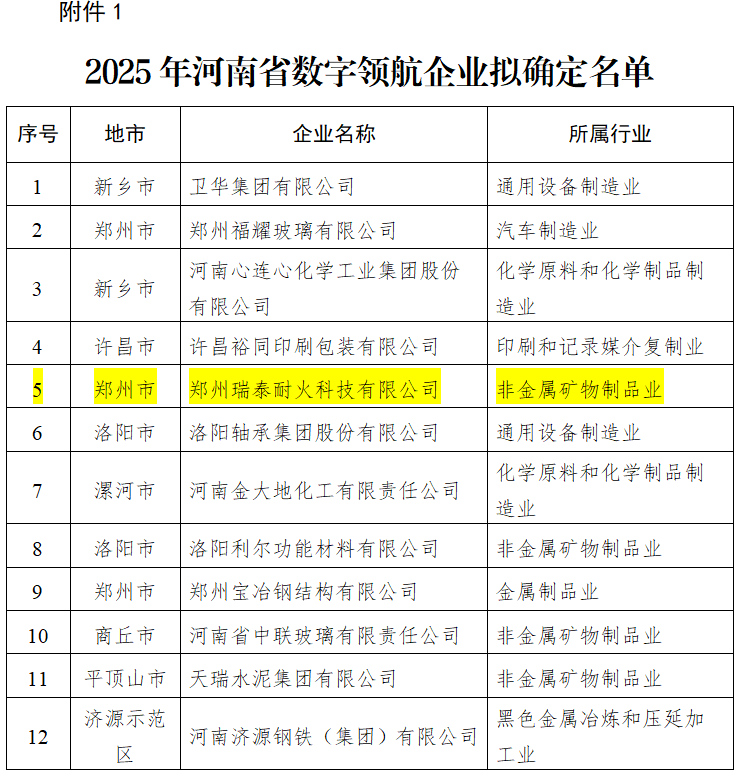 近日,河南省工業(yè)和信息化廳公示了2025年河南省數(shù)字領(lǐng)航企業(yè)、數(shù)字化轉(zhuǎn)型“小燈塔”企業(yè)、服務(wù)型制造創(chuàng)新企業(yè)(平臺(tái))名單,鄭州瑞泰耐火科技有限公司成功榮獲“2025年河南省數(shù)字領(lǐng)航企業(yè)”稱號(hào)。