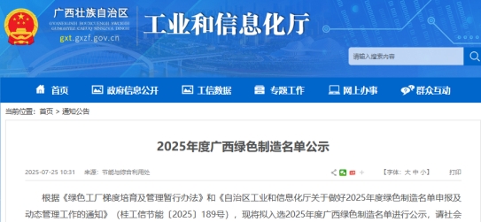 近日,廣西工信廳發(fā)布“2025年度廣西綠色制造名單公示”。