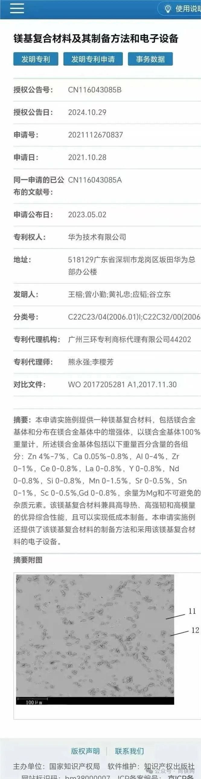 近日,國(guó)家知識(shí)產(chǎn)權(quán)局信息顯示,華為技術(shù)有限公司取得一項(xiàng)名為“鎂基復(fù)合材料及其制備方法和電子設(shè)備”的專(zhuān)利,授權(quán)公告號(hào)CN 116043085 B,申請(qǐng)日期為2021年10月。該專(zhuān)利來(lái)自于上海交通大學(xué)曾小勤教授團(tuán)隊(duì)與華為技術(shù)有限公司產(chǎn)學(xué)研項(xiàng)目的合作成果。