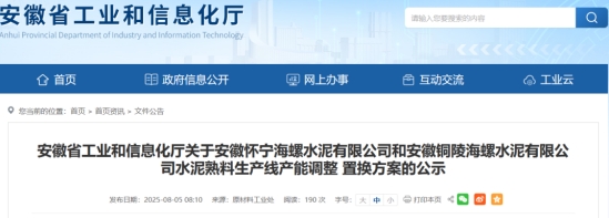 8月5日,安徽省工信廳發(fā)布“關(guān)于安徽懷寧海螺水泥有限公司和安徽銅陵海螺水泥有限公司水泥熟料生產(chǎn)線產(chǎn)能調(diào)整 置換方案的公示”。