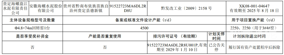 退出產(chǎn)能來自銅仁海螺盤江水泥有限責(zé)任公司1條4500t/d水泥熟料生產(chǎn)線,該線已公告關(guān)停,計(jì)劃履行國有資產(chǎn)處置程序后拆除。