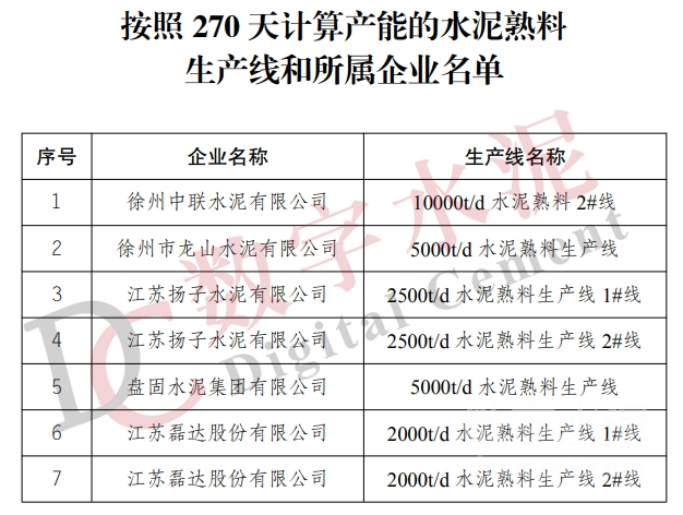 根據(jù)公示,江蘇省7條水泥熟料生產(chǎn)線年生產(chǎn)天數(shù)按照270天計(jì)算。