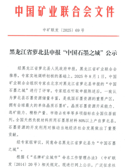 經(jīng)專家組審議,同意命名黑龍江省蘿北縣為“中國石墨之城”。