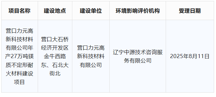 報(bào)批稿-營(yíng)口力元高新科技材料有限公司年產(chǎn)27萬(wàn)噸鎂質(zhì)不定形耐火材料建設(shè)項(xiàng)目