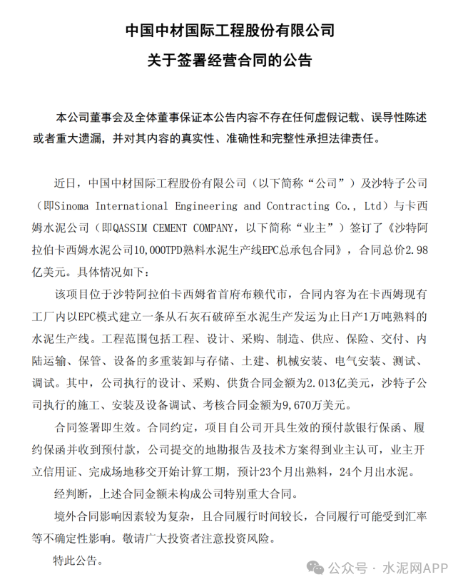 8月15日,中材國(guó)際公告稱,公司及沙特子公司與卡西姆水泥公司簽訂了《沙特阿拉伯卡西姆水泥公司10,000TPD熟料水泥生產(chǎn)線EPC總承包合同》,合同總價(jià)2.98億美元(約合21.4億元人民幣)。