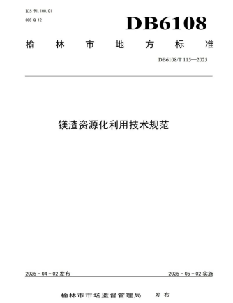 榆林市地方標(biāo)準(zhǔn)《鎂渣資源化利用技術(shù)規(guī)范》(DB6108/T 115—2025)已經(jīng)由榆林市市場監(jiān)督管理局于2025年4月發(fā)布,5月2日起實施。