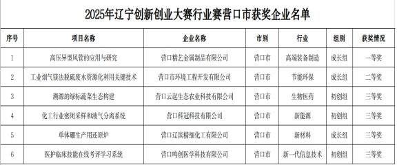 此次賽事中,營口參賽企業(yè)聚焦細分領域深耕細作,多個項目憑借技術創(chuàng)新性、市場應用價值及產(chǎn)業(yè)化前景獲得評委認可。其中,營口精藝金屬制品有限公司的“高壓異型風管的應用與研究”項目,特殊材質(zhì)滿足超低溫要求,適配高端裝備制造等特殊場景需求,填補國家空白;營口市環(huán)境工程開發(fā)有限公司的“工業(yè)煙氣鎂法脫硫廢水資源化利用關鍵技術”,為環(huán)保領域破解廢水處理難題、實現(xiàn)資源循環(huán)提供新路徑;營口云起生態(tài)農(nóng)業(yè)科技有限公司“溯源的綠標蔬菜生態(tài)構(gòu)建”項目,搭建農(nóng)產(chǎn)品全鏈條質(zhì)量追溯體系,助力農(nóng)業(yè)高質(zhì)量發(fā)展;營口鳴創(chuàng)醫(yī)學科技有限公司的“醫(yī)護臨床技能在線考評學習系統(tǒng)”項目,為醫(yī)療領域人才培養(yǎng)與技能考評提供數(shù)字化解決方案;營口科冠科技有限公司“化工行業(yè)密閉采樣和液氣分離系統(tǒng)”、營口遼濱精細化工有限公司“單體硼生產(chǎn)用還原爐”項目,則分別在化工安全升級、高端材料制造設備優(yōu)化上展現(xiàn)技術優(yōu)勢。